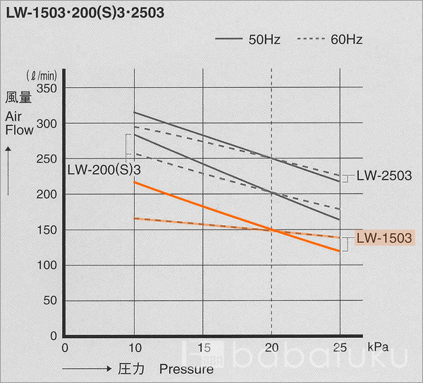 新保護スイッチの搭載により、ダイヤフラム破損時の、ブロアー(エアーポンプ)内部の 破損トラブル防止に役立ちます。 散気管や配管に詰まりがあり、ブロアーに負荷が掛る場合、空気を抜きます。 風量と圧力の関係図です。圧力が大きくなると風量は下がります。 この商品はオレンジ色のグラフが対象となります。  商品の各サイズです。画像拡大はこちら。(拡大図)  スペックの値です。オレンジ色の部分がこの商品の対象値になります。 画像拡大図はこちらからご覧になれます。(拡大図)  万が一、不具合で回収する等のトラブルが発生しても問題ないように、 お客様の購入品番を独自に保存して保証書カードを発行させて頂いております。  こちらの商品は通常の半額以下で塩素剤5本セットをお付けしたセット商品になります。 塩素剤は浄化槽から河川に水を放流する際に消毒をします。 | 電圧(V) | 200V | 周波数(Hz) | 50Hz/60Hz | | 吐出口径(cm) | φ2.6 | 風量(L/min) | 150L/min | | サイズ(cm) | 横34.0 縦22.0 高さ21.6 | 重量(kg) | 14.1kg | | 常用圧力 | 20kPa | 相 | 三相 | 弊社でのご購入メリットブロアー等の浄化槽用品は購入までの時間より、購入後の時間の方が長く、 すぐに機能しなくなってしまっては意味がありません。 浄化槽管理暦35年以上のプロの選んだ取り付け部品、独自保証システム、さらに 1万円以上ご購入頂いたお客様には「浄化槽コミュニティ」へご招待させて頂いてます。