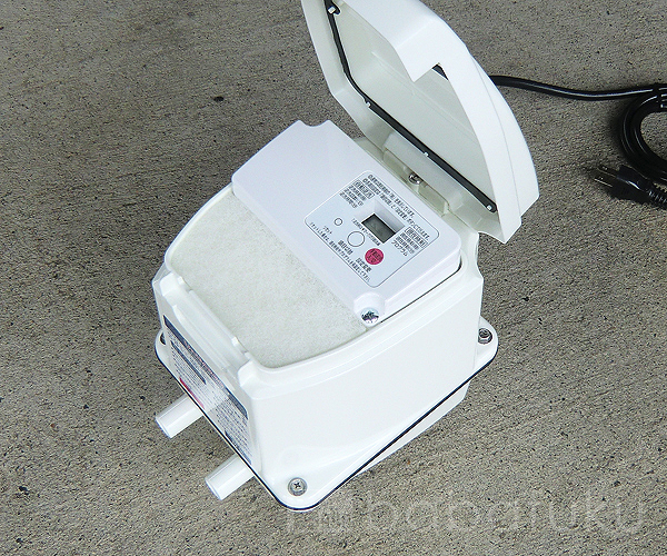 フジクリーン製の浄化槽ブロアーになります。 正面からみた図。逆洗と散気の所にシールが貼ってあります。 横からみた図。コンセントの長さは1.8mです。