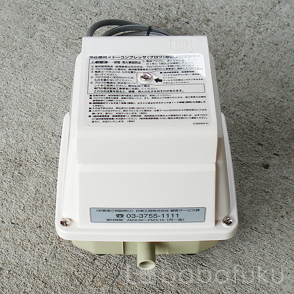 日東工器LA-30Cは独自のピストン方式を採用しており、 ![]() ![]() 実際に浄化槽を点検している立場からするとピストン方式で長期間使用できる 新しいタイプの名称と注意する点 以前からおすすめさせて頂いていた日東工器ですが、さらに省エネにも注力した 見た目やサイズ、色は以前と変わりませんが、中身が格段に進歩しています。 省エネで家計にも優しい新タイプ 新タイプになり今まで以上に省エネになりました。 少ないエネルギーで同等の効果が期待できる為、二酸化炭素の排出量も 空気を送る吐出口の直径は1.8cmで、同風量の他のメーカーのものと同じなので、 送風量の多い日東工器LA-40Cもございます。少人数でないご家庭や人槽が 長期間使用頂ける秘密 ブロアーの駆動方式として主にピストン式とダイヤフラム式がありますが、 ![]() 新しいLA-30Cと40Cには風量60以上(LA-60E以上)で使われている ![]() ピストンが金属のシリンダ内面を抵抗なく滑るように動いているため、 ![]() ピストンはダイヤフラムと異なり、破けて突然停止することはありません。 静かさに配慮した設計 浄化槽のブロアーはサイズが小さくなると、最初は良くても 日東工器株式会社について ![]() 日東工器株式会社は1978年の発売以来、40年以上に渡り主に浄化槽で ![]() タイプ別の歴史で見ると、1978年のA1011、A1006からスタートして、 商品スペックなど ブロアーのフタの上に取り扱い注意事項が記載されてます。 ブロアーの後ろにコンセントが付いてますので、 弊社で独自に各ブロアーに適合した「取り付け部品付き」を無料添付させて 上部から見ると正方形に近い形が特徴的。小さくて場所をとりません。 ![]() 安心の独自1年保証 ![]() 万が一、不具合で回収する等のトラブルが発生しても問題ないように、 ![]() こちらの商品は通常の半額以下で消臭剤をお付けしたセット商品になります。